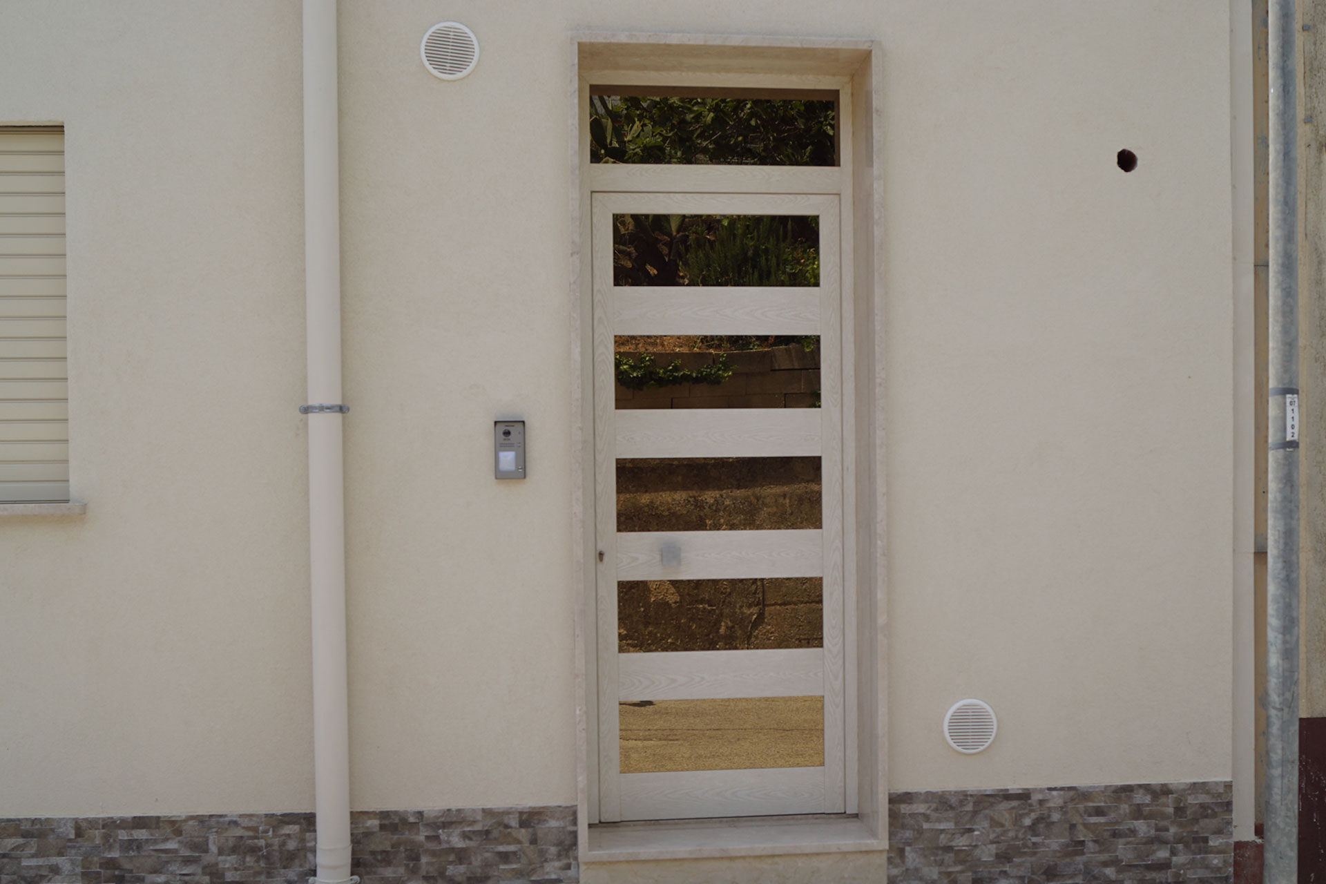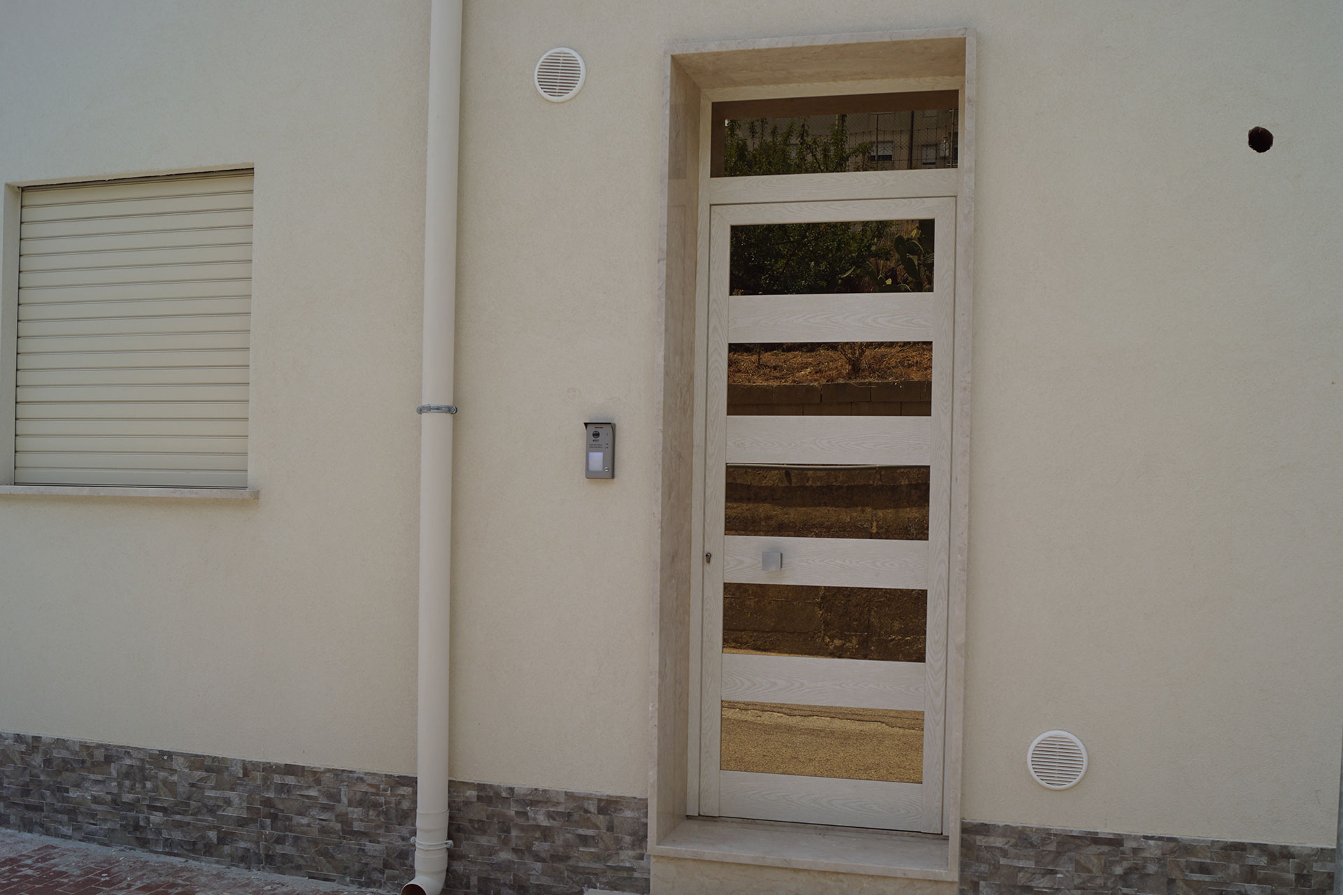 Portoncino da esterno in alluminio. La struttura per questo portoncino è in alluminio, con diverse personalizzazioni, dal colore bianco all’effetto legno. Inoltre per una maggiore privacy sono stati applicati vetri specchiati.